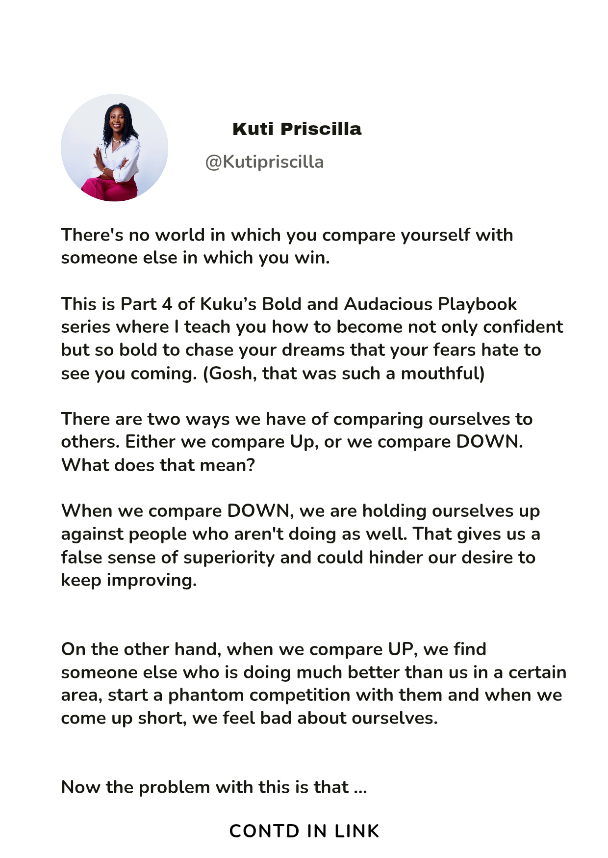 but in certain context comparison is actually a good thing/tool because it allows one to see just how far the distance between your current postion and your destination(clarity of distance)....this can serve as a reminder of the journey needed and also serve to measure your efforts and how to either redouble or reaffirm your actions(Acting as a Benchmark for growth and motivation)....also comparison helps your identify your own unique strength and highlights your weakness too, it does this when you compare and then self reflect on why your own journey seems to be this way and through this you'd understand more about yourself(self awreness) just like Kuku did when she met the other 3 badass writers 😹